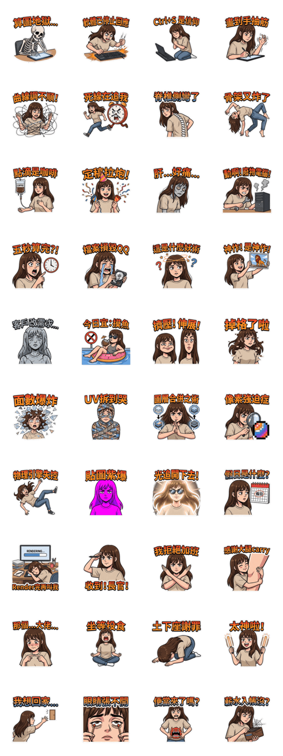 | スタンプ説明 | レンダリング、強制終了、リテイク... アニメーターの悲喜こもごもをアメリカンカトゥーン風に。Ctrl+Sは正義! |