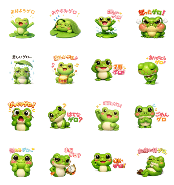 | スタンプ説明 | 金縁の丸眼鏡がトレードマークの蛙のスタンプです。語尾に「ゲロ」をつけて、あなたの気持ちをコミカルに伝えます。日常会話で使いやすい16種類のセットです。 |