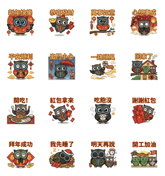 | スタンプ説明 | 16 simple stickers for Year of the Horse chats: New Year greetings, red envelopes, travel safety, family moments, and back-to-work cheers. |