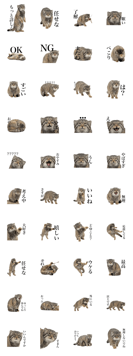 | スタンプ説明 | ずっと使える マヌルネコ 日常 絵文字 スタンプ 写真風 リアル もふもふ ふわふわ かわいい 猫 ねこ 動物 癒し系 表情豊か 人気 使いやすい LINE トーク ※このスタンプはトークルームで大きく表示されるBIGスタンプです。 |
