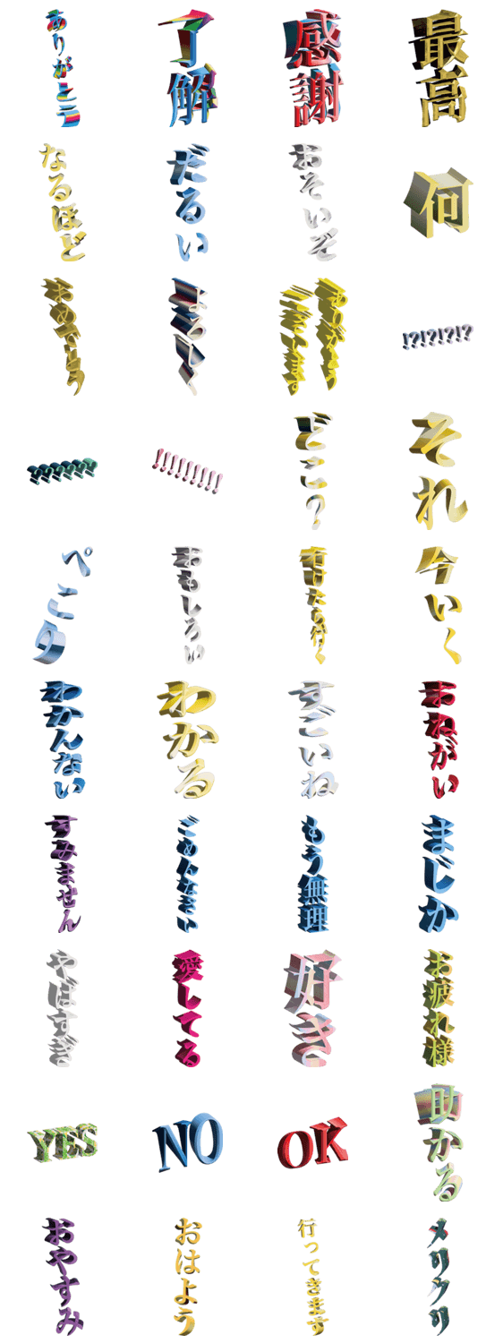 | スタンプ説明 | 3D文字 立体テキスト デカ文字 派手 ギラギラ キラキラ 金 ピカピカ 虹 グラデ 光沢 縁取り 太字 インパクト ネタ 面白い 使いやすい LINE 絵文字 ※このスタンプはトークルームで大きく表示されるBIGスタンプです。 |
