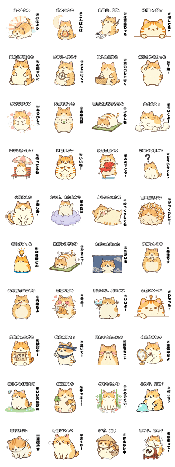 | スタンプ説明 | もちもち可愛いトラ猫が、古風な武士言葉であなたの気持ちを伝えます。「承知つかまつった」「天晴れなり」など、日常で使いやすいセリフが満載。ゆるりといたせ! |