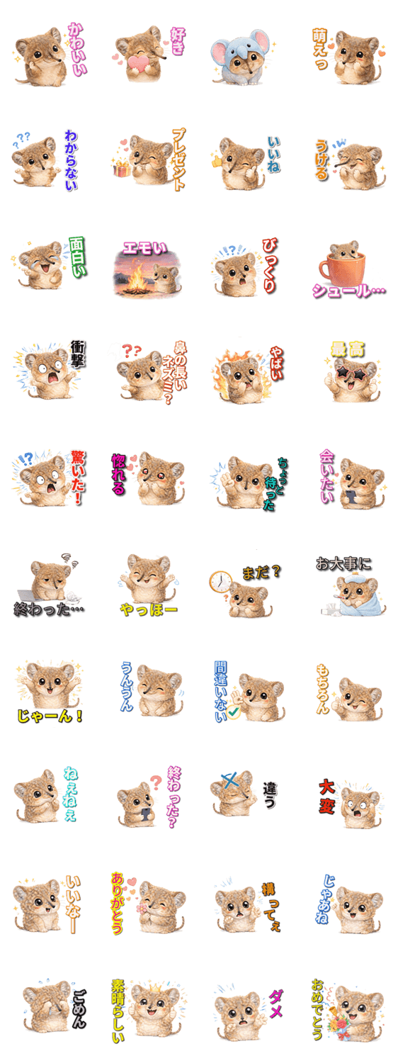 | スタンプ説明 | 象のような長いハナが変わってて個性的で面白い見た目の小動物、とってもかわいい小さい珍獣ハネジネズミのスタンプ |