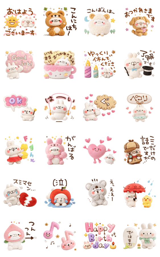 | スタンプ説明 | 使いやすい文字入り表現で動くカラフルな飛び出すスタンプ♡うごく/挨拶/無難/可愛い/立体/ぬいぐるみ/ポップアップ/猫/3D/ねこうさぎの名前シリーズ/山田まぽん作 |
