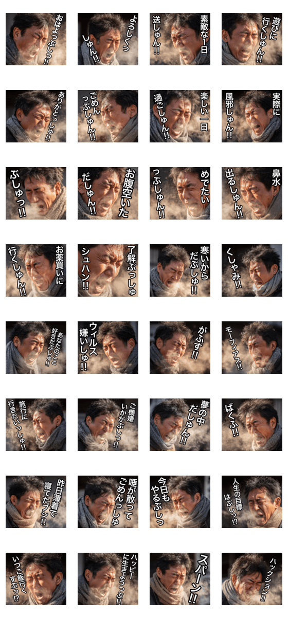 | スタンプ説明 | くしゃみや咳をしながら唾を撒き散らすオジサンのスタンプです。挨拶をしてます。風邪ではないかも。ネタ、面白い、煽り |