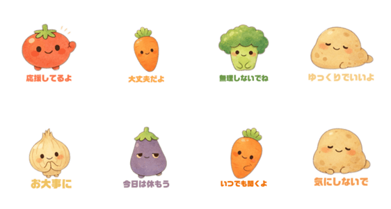 | スタンプ説明 | やわらか野菜シリーズ第2弾。「だいじょうぶ」「無理しないでね」などやさしい気づかいの言葉を集めました。毎日の会話に、そっと寄り添う野菜たちのスタンプです。 |
