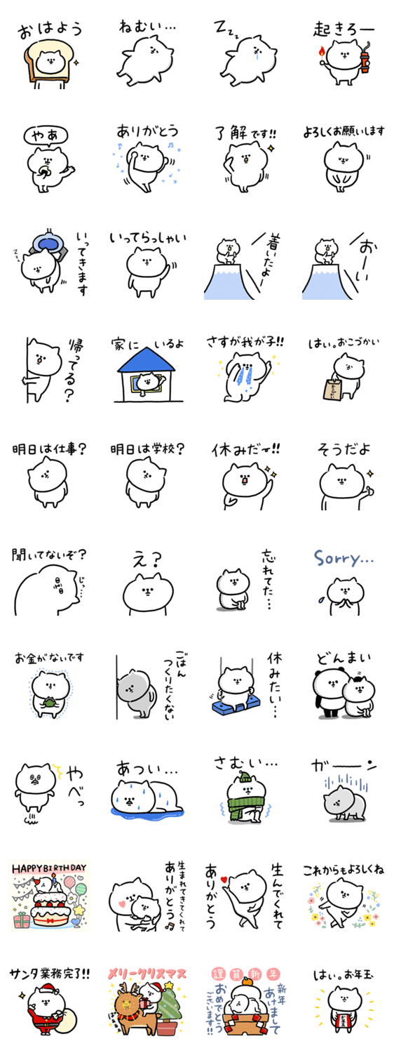 | スタンプ説明 | ネコ 猫 ねこ cat 1年中 日常 毎日 クリスマス 年末年始 お正月 誕生日 お年玉 おこづかい 子供 家族 親子 動物 いってきます 大きい文字 シンプル 見やすい 老眼 シュール |