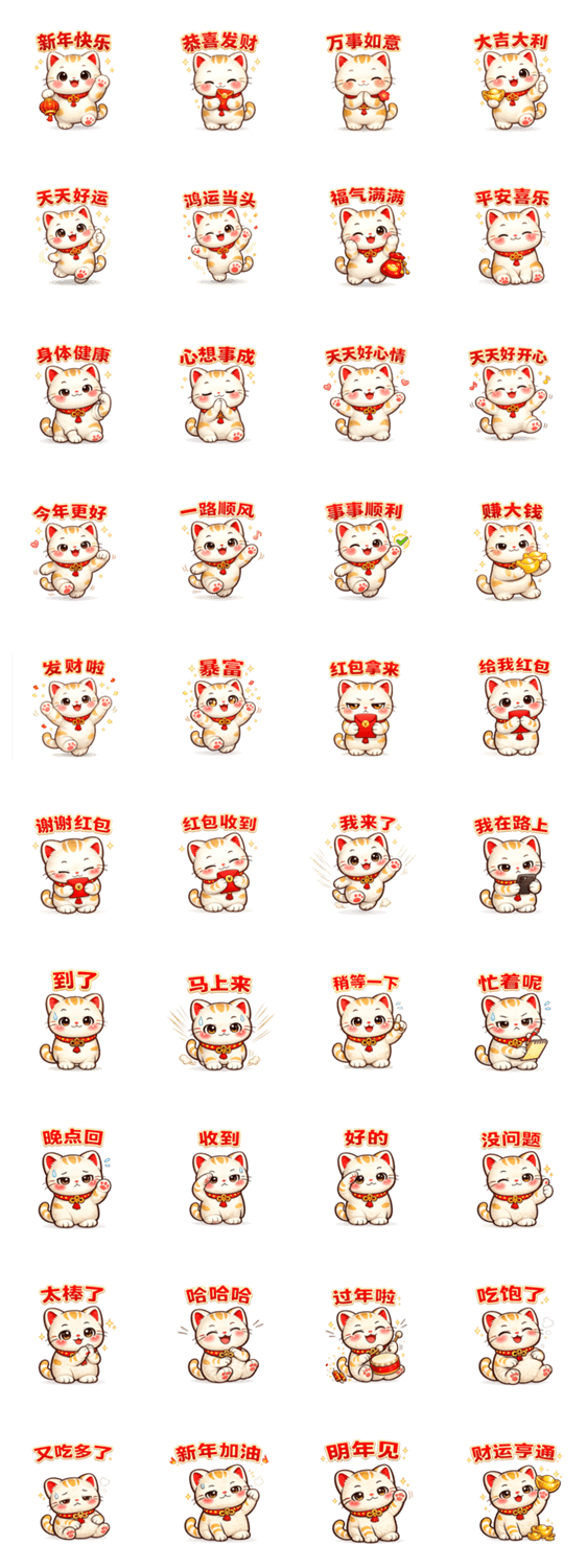 | スタンプ説明 | 春節・旧正月に使える、招き猫のかわいい簡体字スタンプ。新年のあいさつ、红包ネタ、日常返信までこれ一つ!友だち・家族・同僚とのトークに。 |