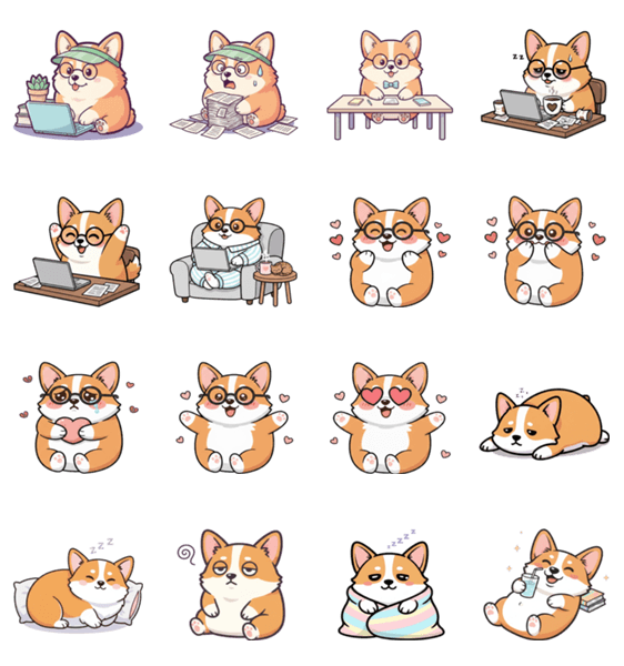 | スタンプ説明 | A cute corgi sticker pack showing daily life moments working, loving, and being lazy. Perfect for everyday chats and emotional reactions |