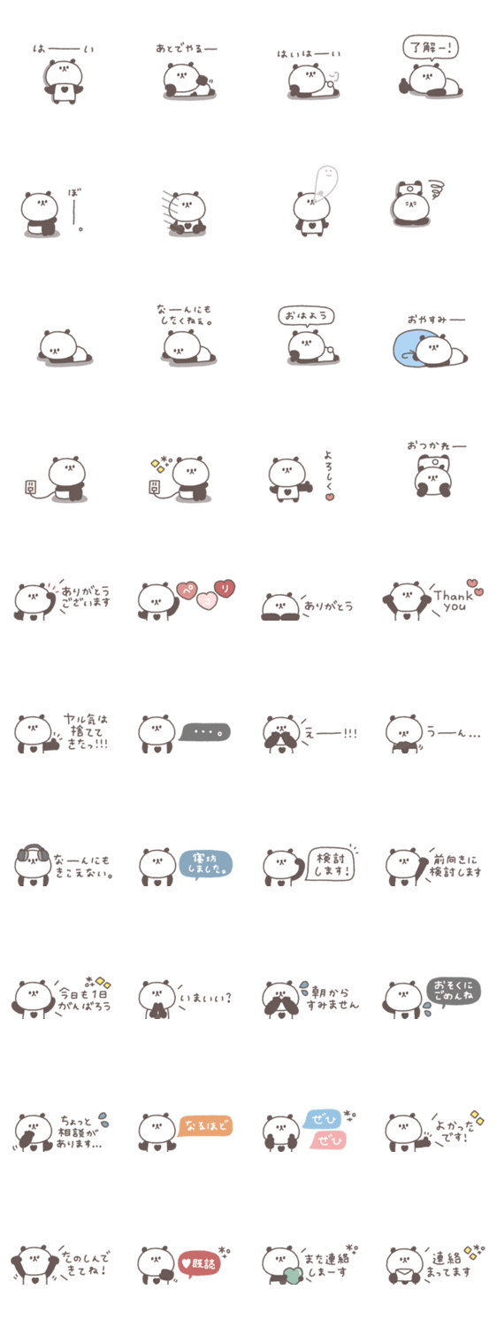 | スタンプ説明 | 一つあると便利な小さくてかわいいぱんだのスタンプです。 パンダ/大人可愛い/シンプル/あいさつ/吹き出し/くすみカラー/無気力 |