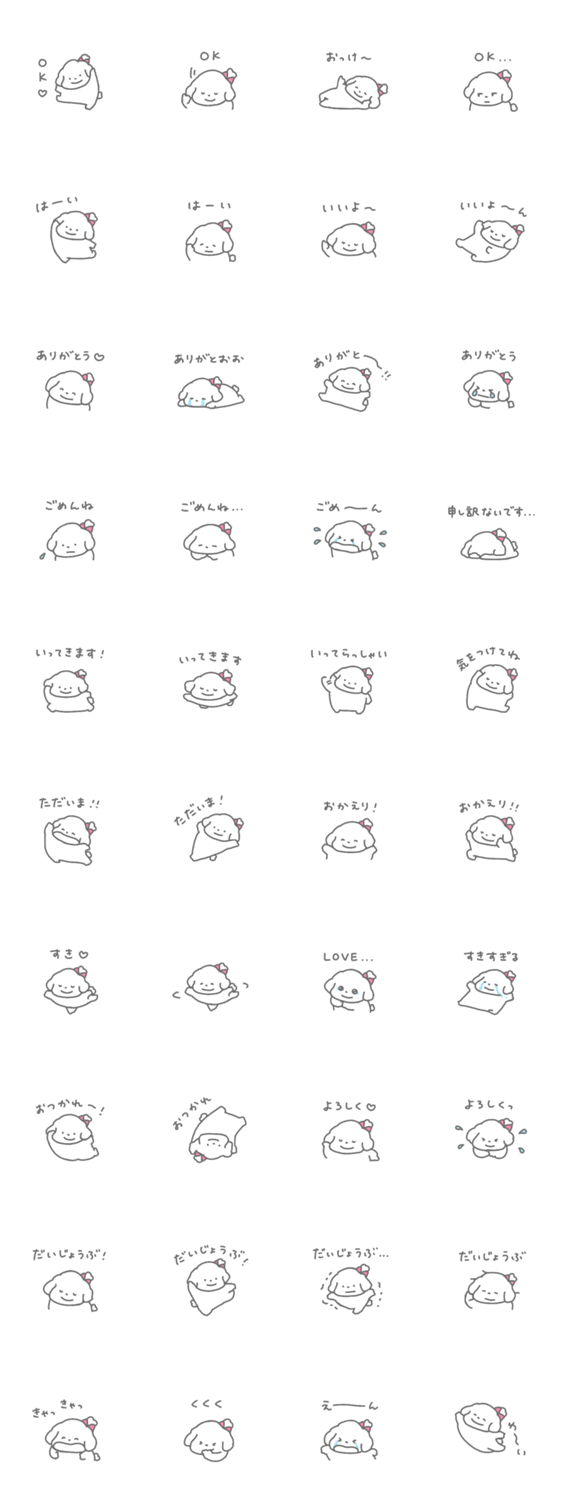 | スタンプ説明 | 同じ言葉でも表情いろいろ。日常でよく使う言葉を、表情違いであえて複数パターン収録しました。気分で使い分けできて、飽きずに毎日使えます♪ #しろいぬちゃん/カップル |