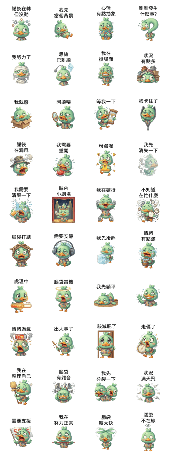 | スタンプ説明 | 毎日がハチャメチャな時、この緑のアヒルがあなたの代わりに、シュールでカオスな崩壊の瞬間を全力で表現します。 ※このスタンプはトークルームで大きく表示されるBIGスタンプです。 |