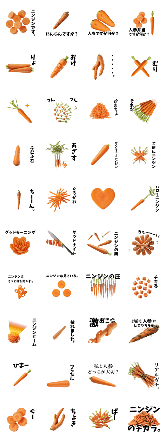 | スタンプ説明 | にんじん100%スタンプ。ニンジンが好きなアナタにも、ニンジン嫌いなアイツにも、栄養満点の人参スタンプでヘルシーなLINEライフをどうぞ。 |
