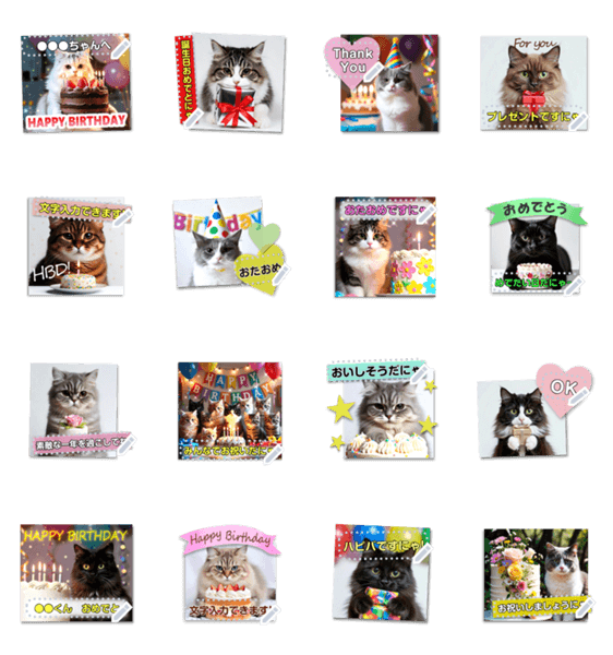 | スタンプ説明 | リアルな黒猫白猫ハチワレちゃん♪にゃんこがいっぱいのハッピーバースデーのグリーティングカード型メッセージスタンプ♪空欄にお誕生日の子の名前などを書き込めます! 現在この商品は一部のスマートフォン版LINE 10.3.0以上のトークルームでのみ使用できます。動作環境の最新情報はヘルプをご確認ください。 |