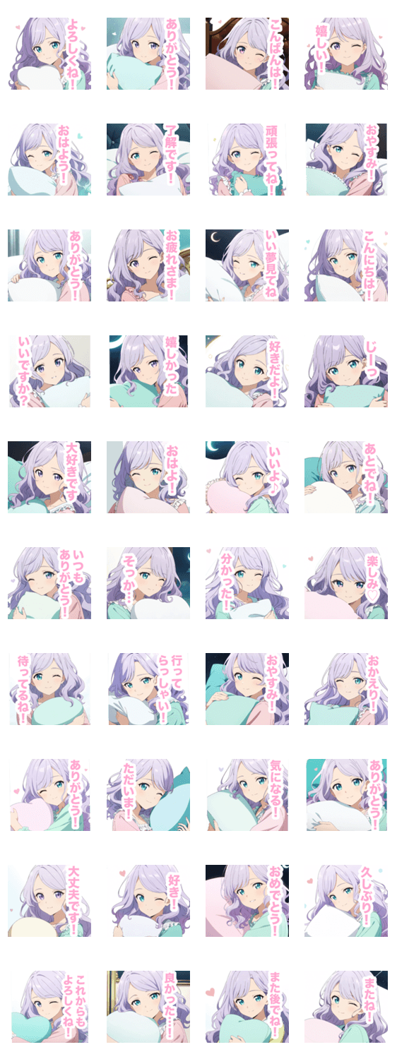 | スタンプ説明 | 日常的なセリフ付きです。アニメ/パープル髪/女の子/女子/美少女/かわいい/可愛い/毎日使える/挨拶/会話/ふんわり/甘い/彼女/恋人/気遣い/癒し/パジャマ/枕 |