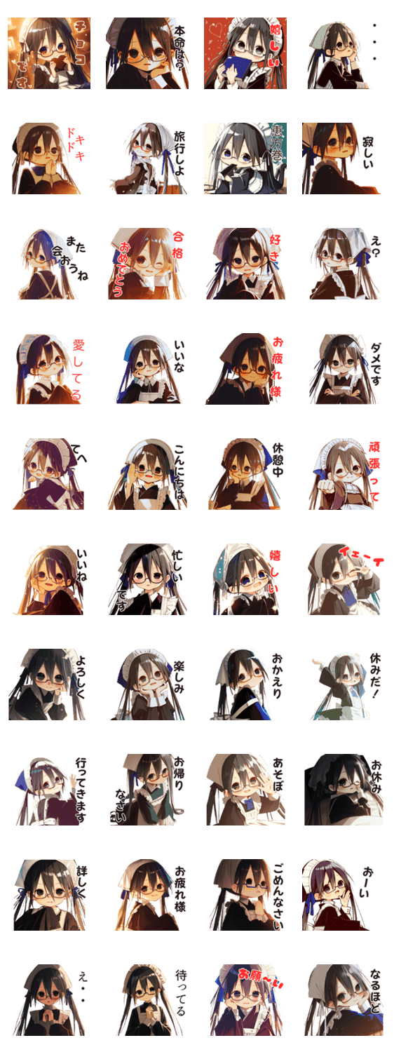 | スタンプ説明 | 影絵風のシンプルなデザインと、 かわいいメイドの日常スタンプ第3弾です。 「好き」「合格おめでとう」など、 気持ちを伝えたい場面で使いやすいスタンプを揃えました。 |