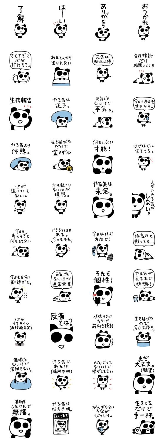 | スタンプ説明 | BIGに伝える!私の名前はパンダです。 もっとゆっくりいきましょう。 子供の落書きのようなゆるいスタンプです。 シンプル/ゆる/シュール/パンダ/無気力/あいさつ ※このスタンプはトークルームで大きく表示されるBIGスタンプです。 |