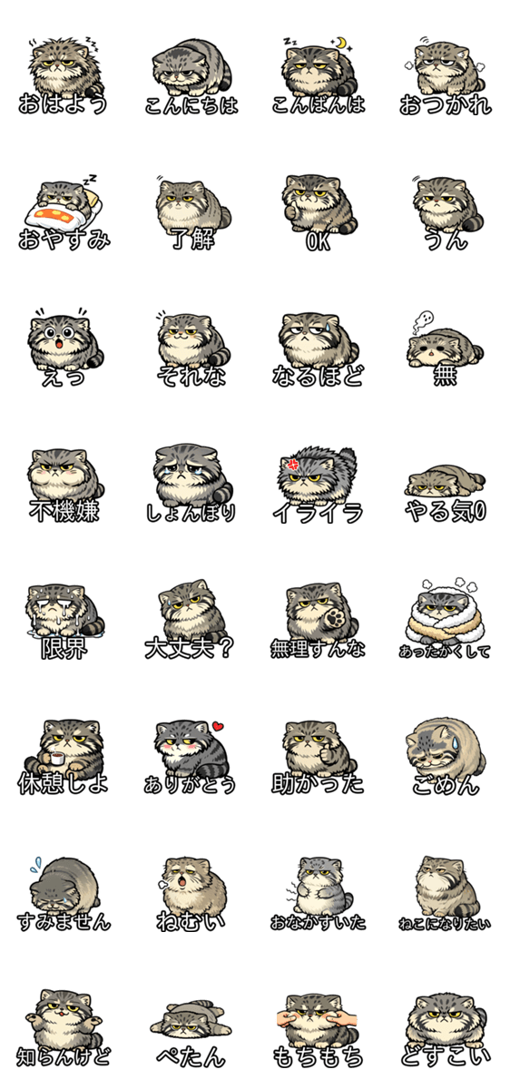 | スタンプ説明 | 太っちょで不機嫌、でもなぜか可愛いマヌルネコのスタンプ32個セット。挨拶、返事、無や限界、気遣いまで渋い顔でこなします。「ねむい」「おなかすいた」も収録! |