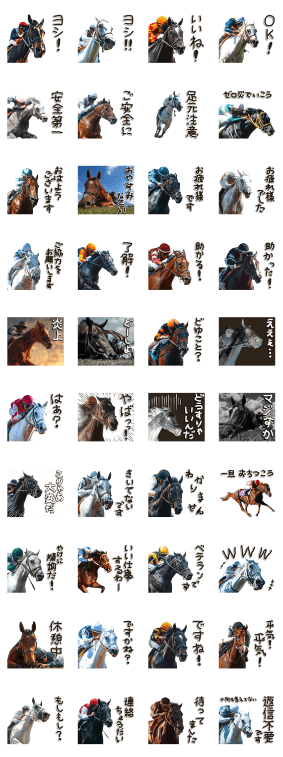 | スタンプ説明 | 春夏秋冬年中使える/馬/うま/ウマ/Horse/名馬/競馬/競走馬/午年/午/騎手/丁寧/敬語/挨拶/あいさつ/日常/毎日/現場/仕事/労働/人気/おすすめ/2038/令和20年/2050/2062/2074 |