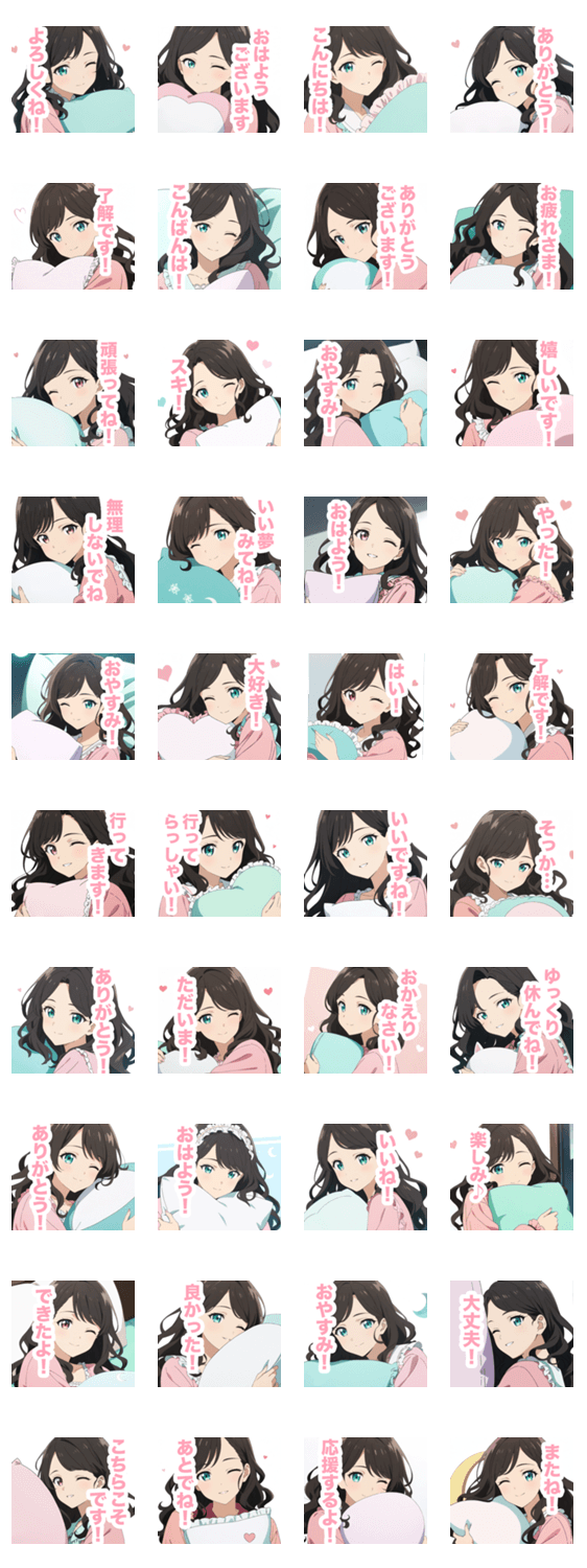 | スタンプ説明 | 日常的なセリフ付きです。アニメ/黒髪/女の子/女子/美少女/かわいい/可愛い/毎日使える/挨拶/会話/ふんわり/甘い/彼女/恋人/気遣い/癒し/パジャマ/枕 |