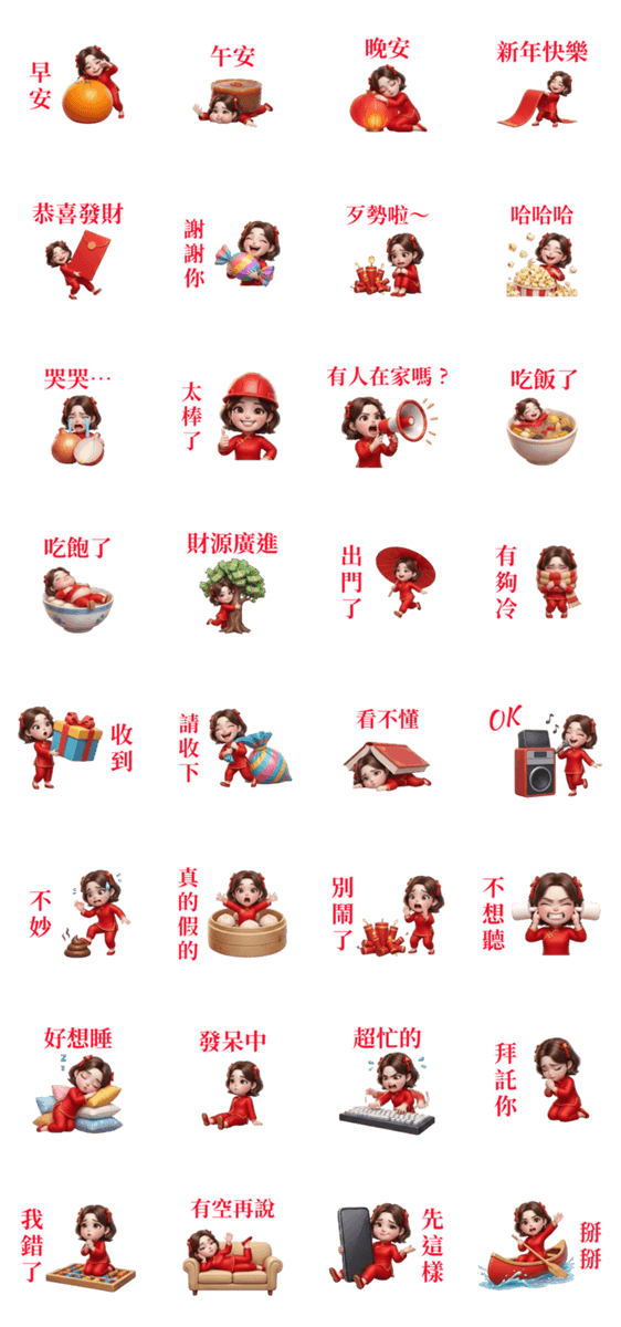 | スタンプ説明 | オレンジや紅包、年菜に囲まれたマギーガール。おはようからおやすみまで、新年の会話はこのセットで全部OK! |