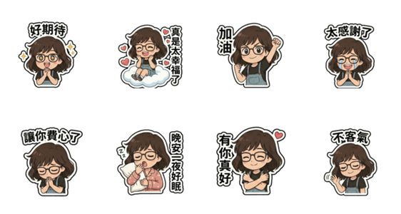 | スタンプ説明 | Designed for those who love life, our vibrant star features charming curly brown hair, signature black-rimmed glasses, and classic denim overalls. |