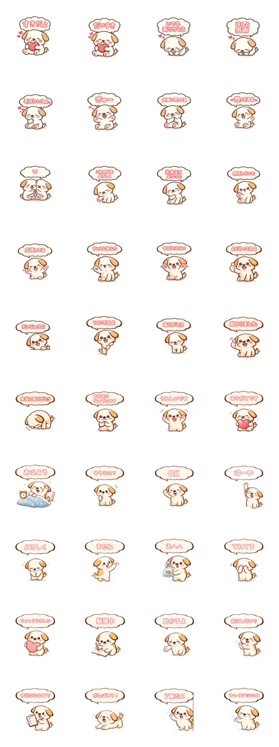 | スタンプ説明 | だらっとした犬が、ありがとう・応援・日常の気持ちをやさしく伝えるスタンプです。家族や友だち、仕事のやりとりにも使いやすい言葉がそろっています。 |