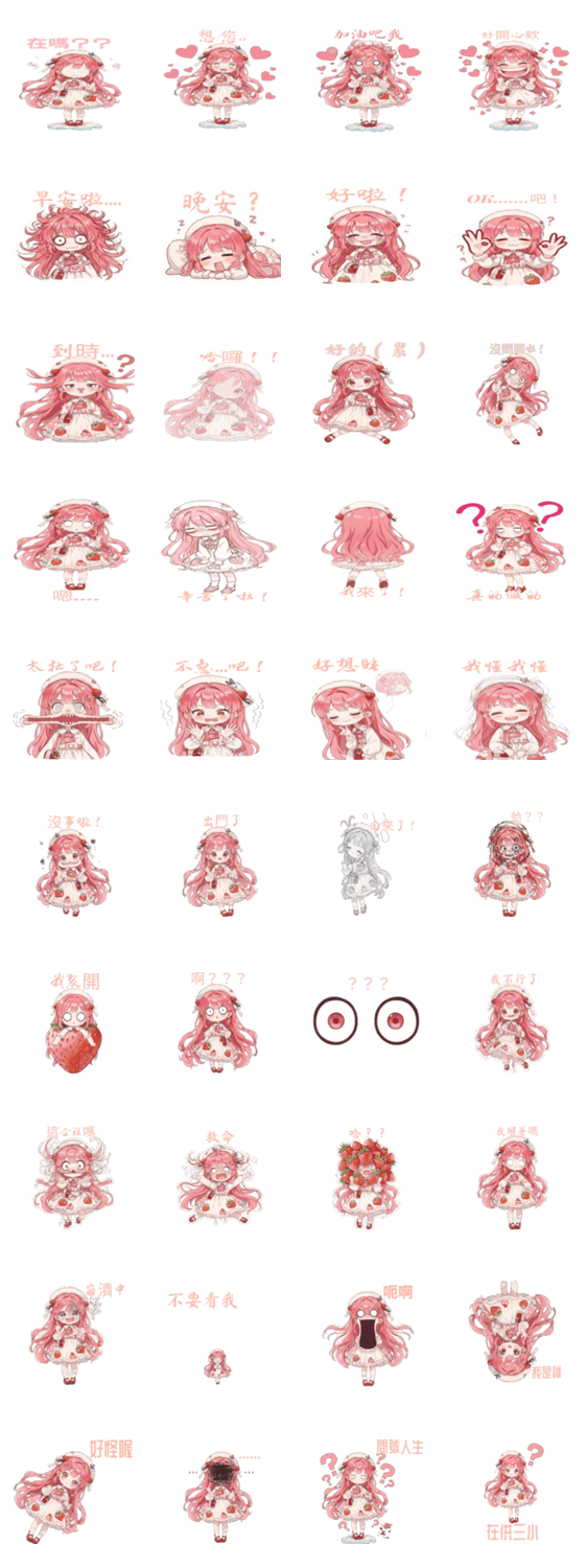 | スタンプ説明 | Sweet on the outside, totally broken inside A strawberry girl with abstract faces, exaggerated reactions, and chaotic emotions. Cute, weird, and addictive. |