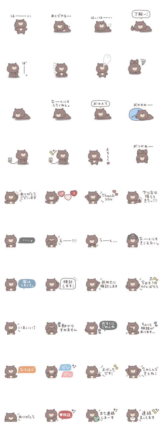 | スタンプ説明 | 一つあると便利な小さくてかわいいくまのスタンプです。 くま/大人可愛い/シンプル/あいさつ/吹き出し/くすみカラー/省スペース/無気力 |
