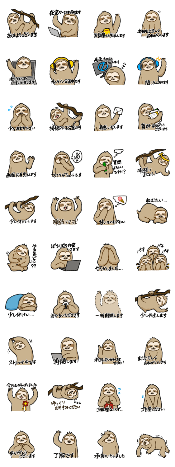| スタンプ説明 | テレワークするナマケモノ/日常会話/春夏秋冬/友達/家族/夫婦/あいさつ/かわいい/ほのぼの/オタク/ほんわか/癒し/面白い/よく使う言葉/毎日使いやすい言葉/仕事/敬語/連絡 |