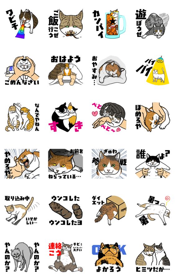 リアルキモかわいい猫マンガからイラストスタンプ第一弾。よく使う日常会話編。
