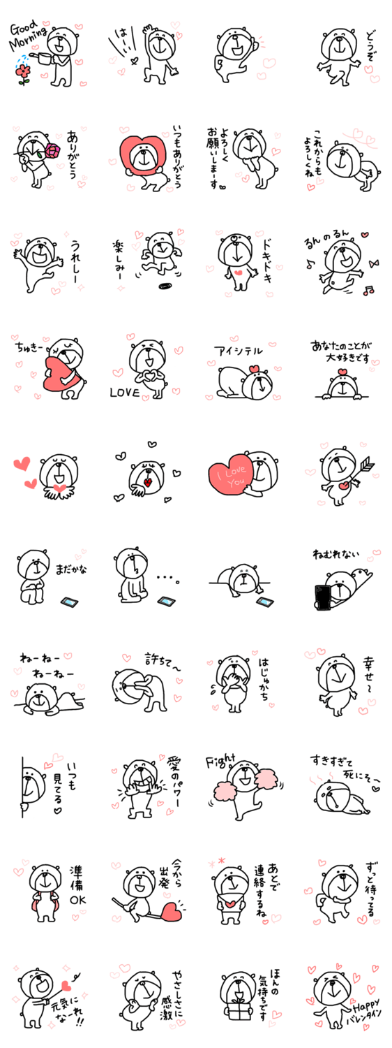 | スタンプ説明 | 線画!黒ラインに白色縁取り★背景どんな色でもOK!シンプルでゆる~いクマさんが愛する人に気持ちを伝えてくれます♡ハート多め/バレンタイン/ずっと/使える/日常/okaki |