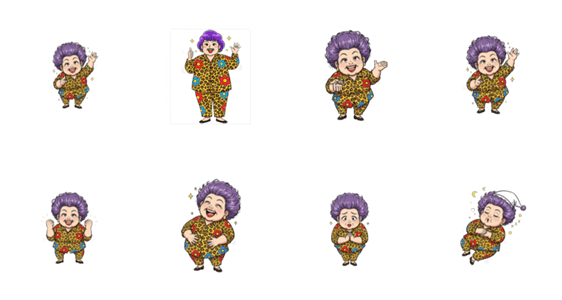 | スタンプ説明 | 紫のパンチパーマとヒョウ柄のシャツがトレードマークの、元気で情に厚い「おばちゃん」たちが、トークを賑やかに彩ってくれるはずです。ぜひご活用ください! |