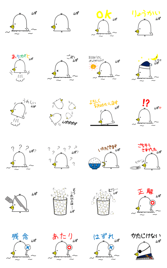 | スタンプ説明 | 『んぽのちょっとひとこと』の24個のスタンプ。日常生活で使えるスタンプです。 |