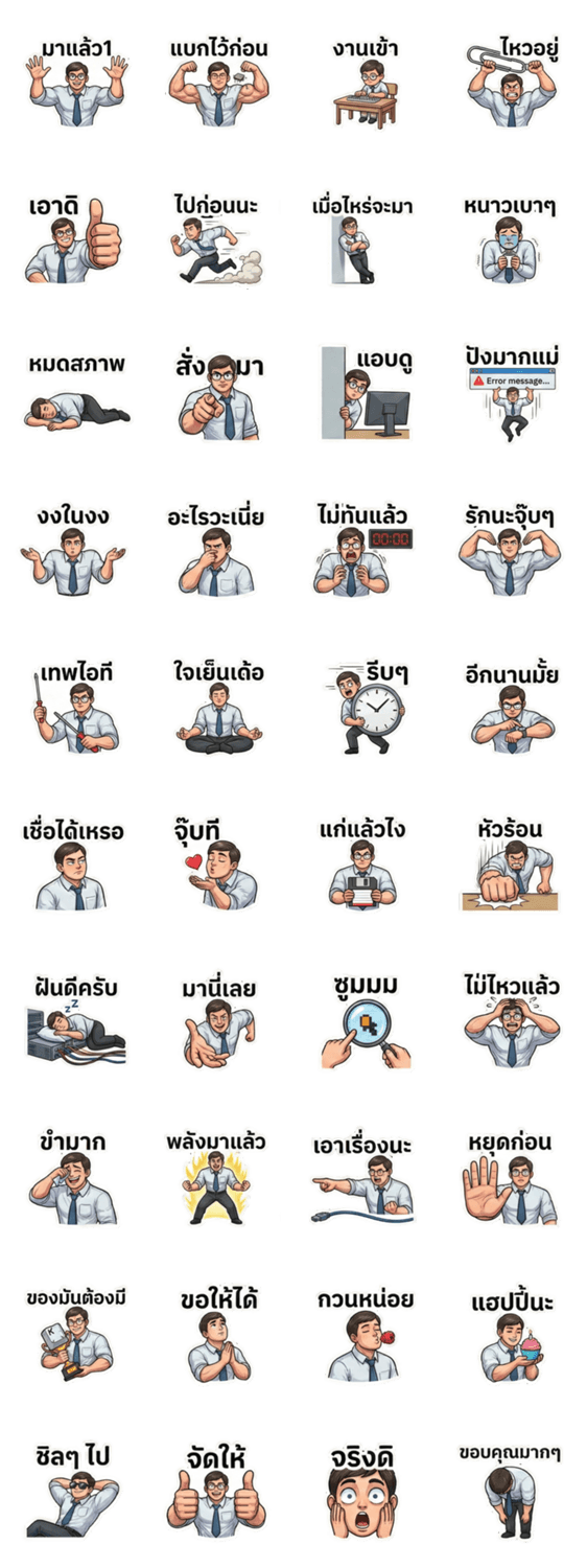 | スタンプ説明 | Meet the indispensable IT guru tiny frame, gigantic muscles! He whines constantly about broken servers, yet manages to deadlift staplers between coding sessions |