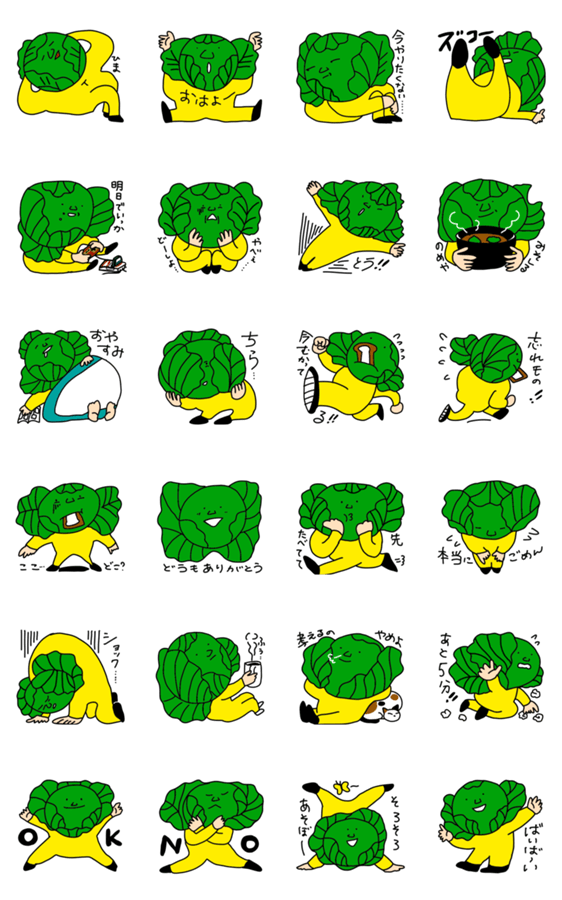 | スタンプ説明 | 「初めまして、キャベツのたまぞうです。趣味は漫画を読むこと。好きな食べ物は味噌汁です。」 |
