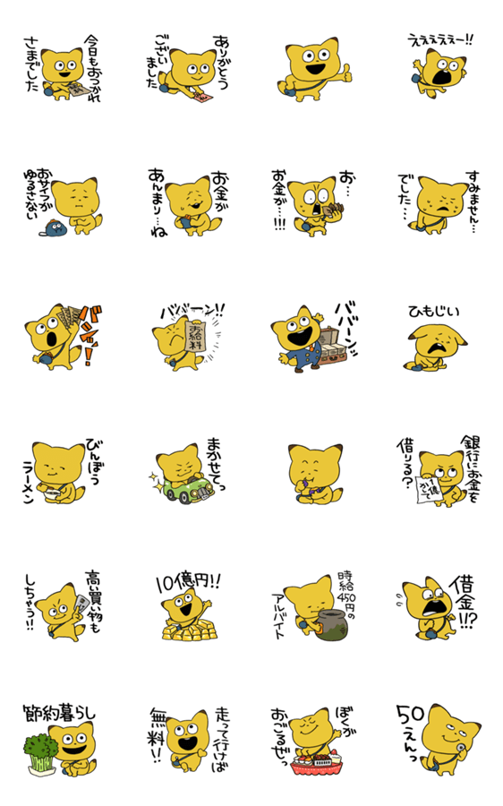 | スタンプ説明 | 金田こんが、とてもいい感じの動きで、お金にまつわる気持ちを表現しています。お金は大事です。made in いいうごき |