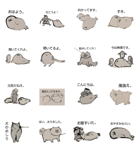 十筆斎が描いたアザラシなどのスタンプ。
