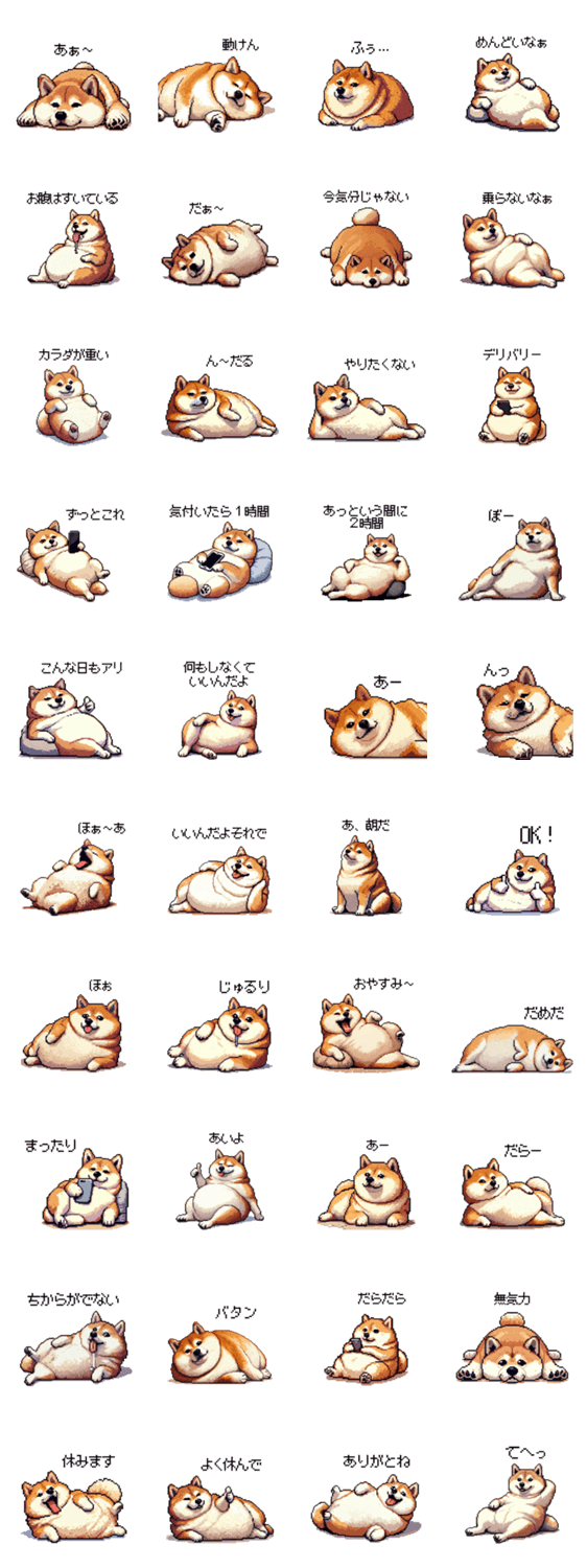 | スタンプ説明 | ダイエット/デブ/犬/前向き/毎日/家族/友達/普段/ずっと/ペット/可愛い/動物/どうぶつ/太っちょ/日常/面倒/仕事/上司/ポジティブ/使える/昼寝/寝る/睡眠不足/睡眠/だらだら |