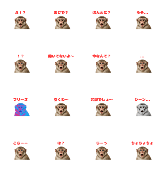 | スタンプ説明 | 思わず「えっ!?」と言いたくなる瞬間に。 写実的で表情が強すぎるサルのリアクションスタンプ。 驚き・動揺・想定外…日常会話で一番使える感情に特化! |