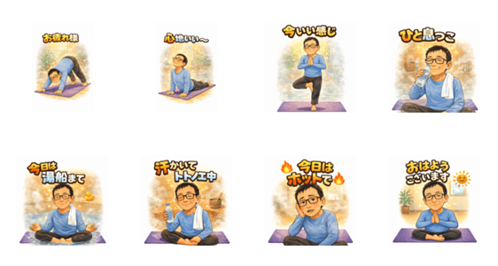 | スタンプ説明 | This is a warm and friendly daily greeting sticker set featuring a dad who loves hot yoga and saunas. Perfect for yoga lovers and sauna fans. |