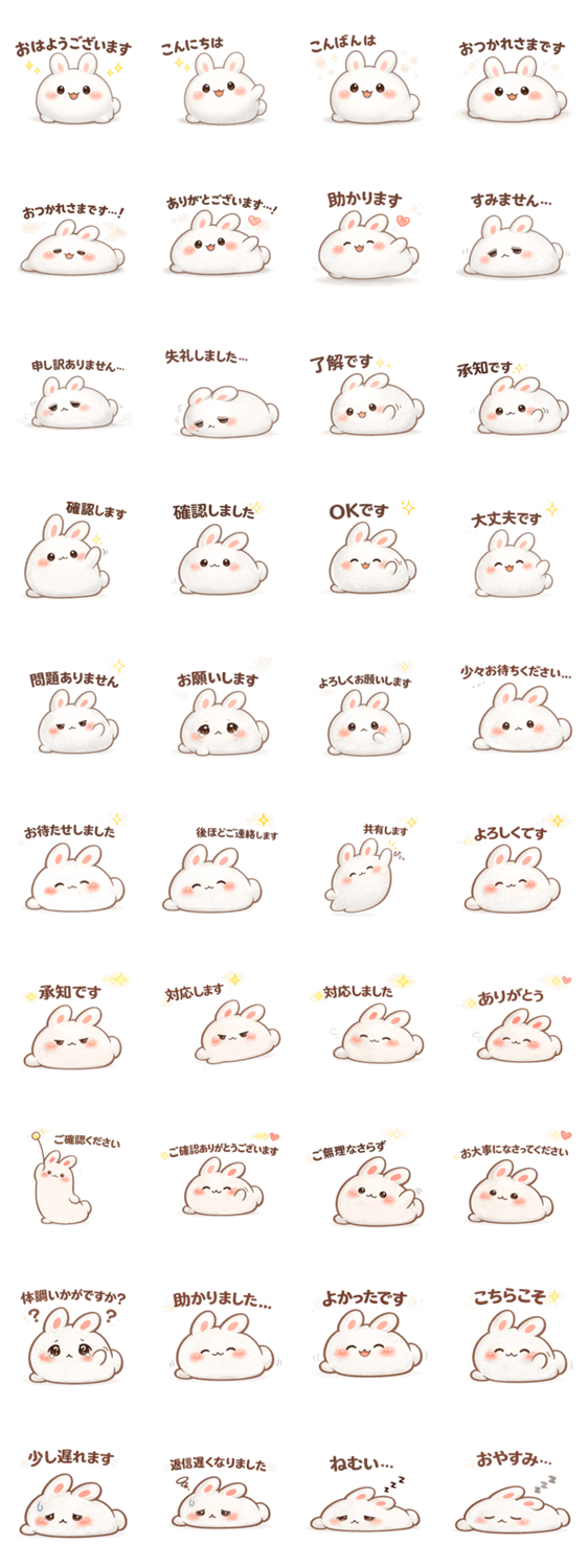 | スタンプ説明 | 仕事や連絡に使える、白い餅うさの丁寧敬語スタンプ。確認・承知・お待ちください・おやすみまで、毎日使えるかわいい返事が揃ってます。 |