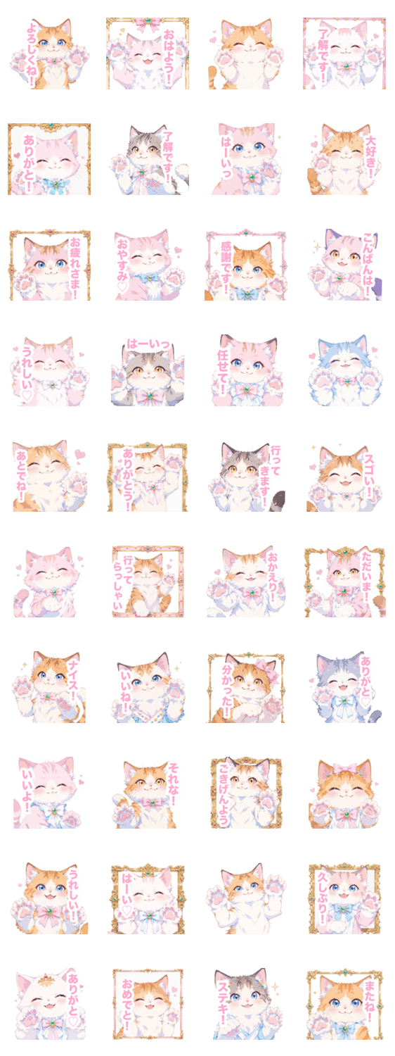 | スタンプ説明 | 日常的なセリフ付きです。かわいい/可愛い/癒し/日常/挨拶/毎日使える/ふわふわ/猫/ネコ/ねこ/ピンク/ハート/スコティッシュフォールド/肉球/ゴージャス/パステル/リボン |