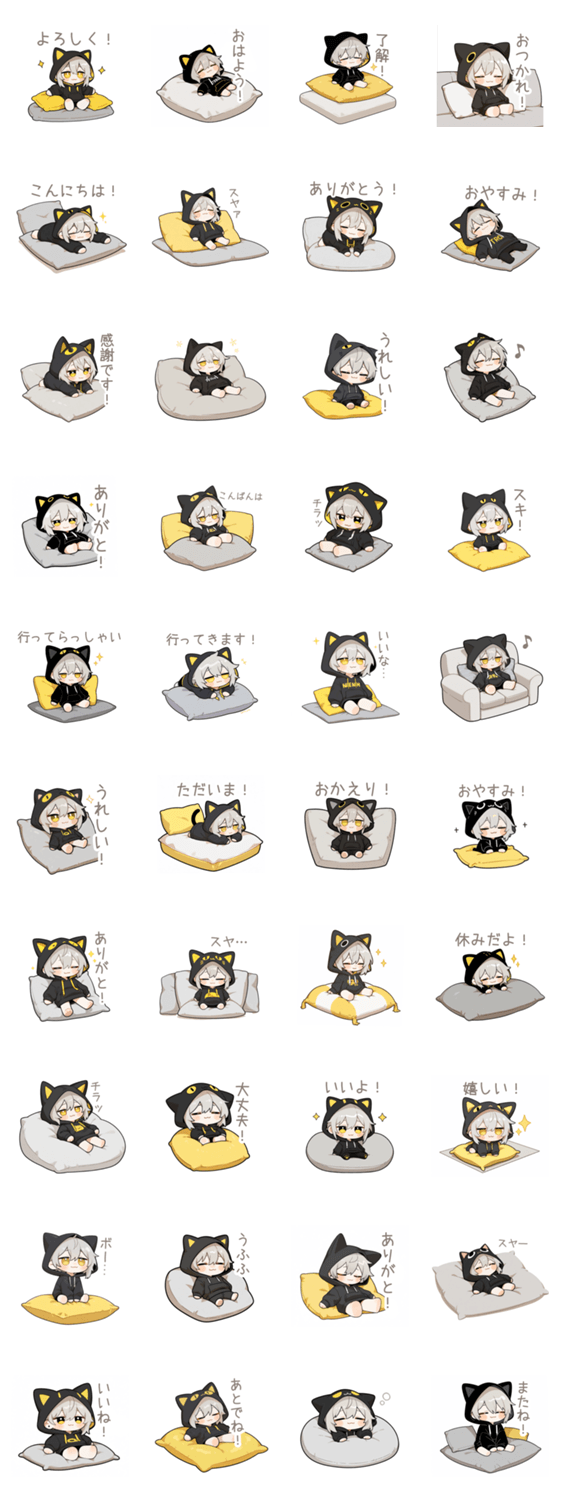 | スタンプ説明 | 日常的なセリフ付きです。男子/男の子/ちびキャラ/シンプル/デフォルメ/癒し/日常/挨拶/毎日/黒色/パーカー/ゆるい/かわいい/可愛い/黒髪/黄色/クッション/猫耳 |