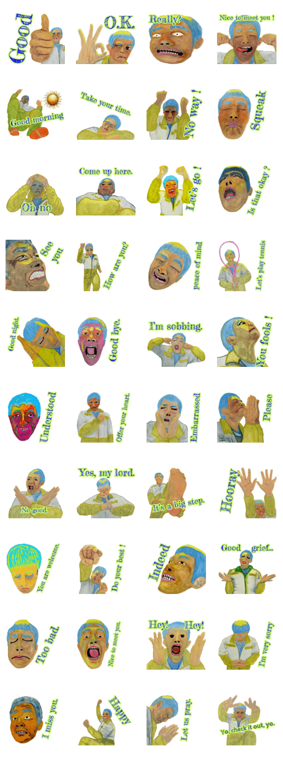 | スタンプ説明 | 青髪おっさんのメッセージ入りのスタンプ。英語バージョンです。使い易いスタンプが多めです。変顔でシュールです。 |