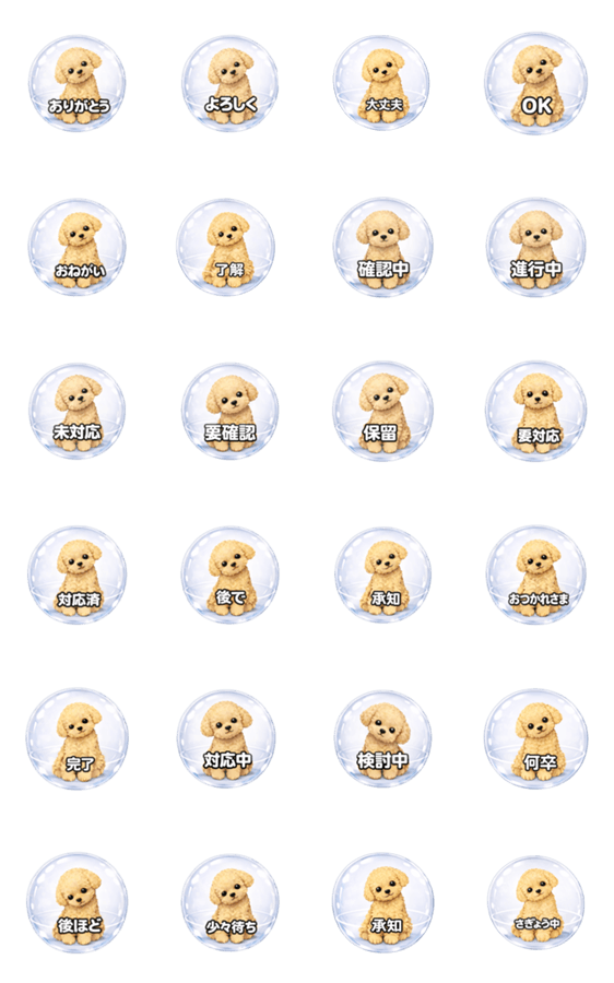 | スタンプ説明 | ガラス玉の中に入った、やさしい表情のトイプードル。仕事や日常のやり取りに使いやすい、シンプルで落ち着いたスタンプです。 |