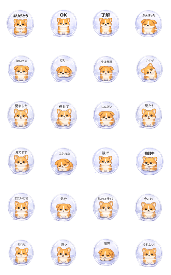 | スタンプ説明 | 透明なガラス玉の中に入った、コーギーのLINEスタンプです。 落ち着いた表情とシンプルな言葉で、「OK」「ありがとう」など、やさしく、静かに気持ちを伝えたいときに。 |