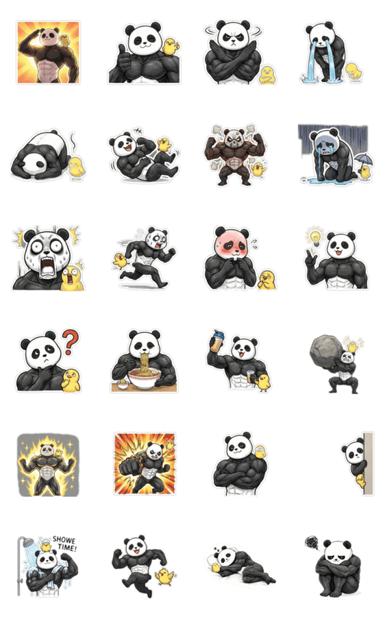 筋肉ムキムキなパンダと可愛いヒヨコの面白リアクション!日常会話で使いやすいLINEスタンプ。