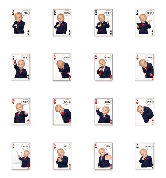 スーツ赤ちゃん×トランプカード風のLINEスタンプ! ドヤ顔&ビジネス口調の一言で、返事もツッコミもおまかせ。