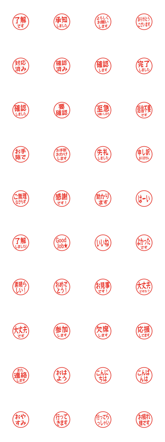 | スタンプ説明 | シンプルな敬語のはんこ風スタンプです。文字が主張しない小さめサイズで、余白を多めにしています。会話の流れを邪魔せず、連絡や仕事の返事に使いやすいデザインです。 |
